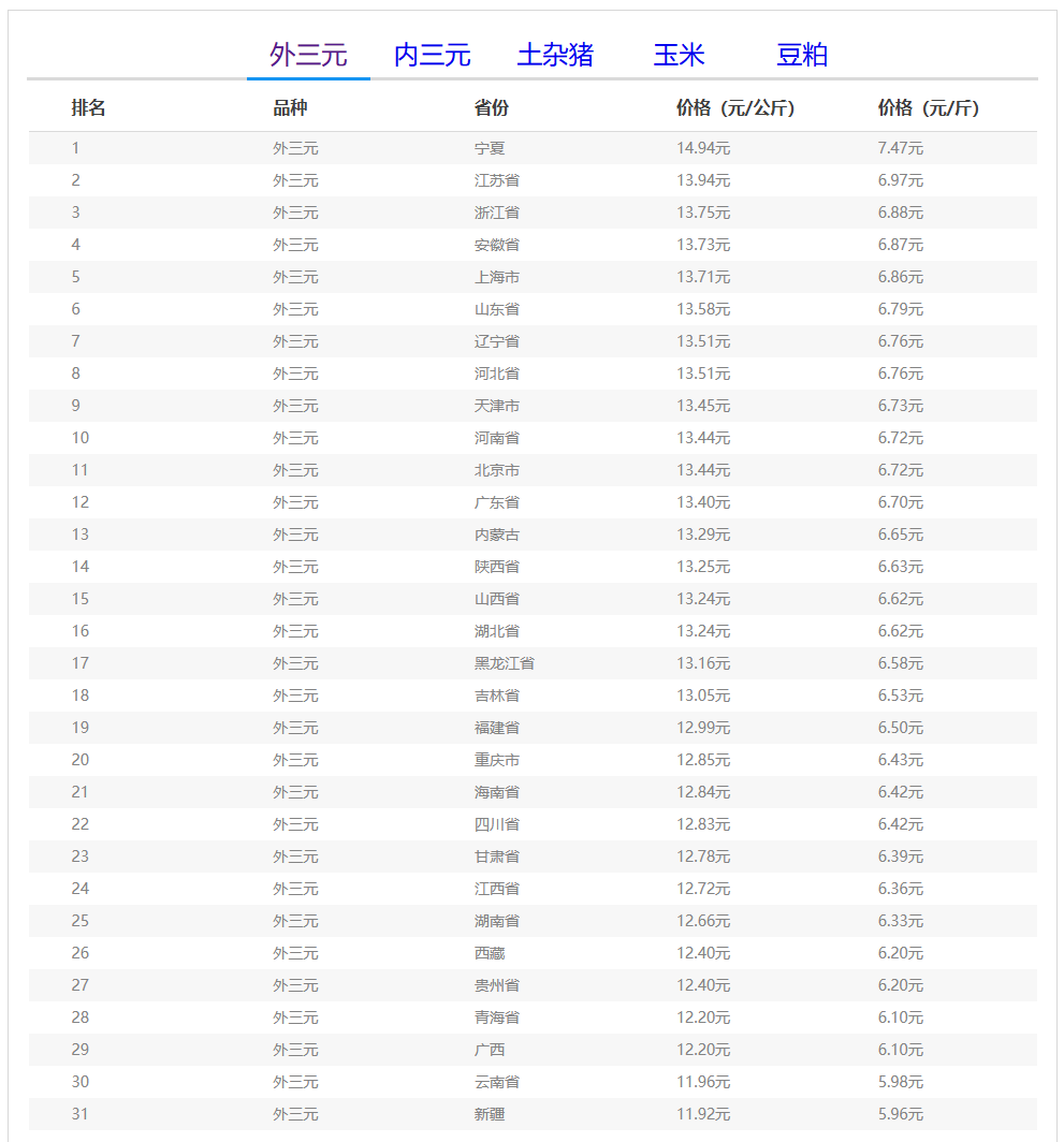 全国外三元生猪价格排行榜