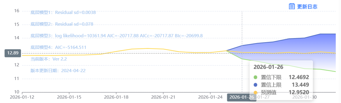 玄田算法是由项目课题组团队原创的非经典逻辑数值聚合理论和不确定性预测方法,构建了基于一致模算子的生猪价格预测模型。该模型采用的聚合函数及一致模相关理论与方法已获得多项国家自然科学基金和省级自然科学资金资助,并获得多项省级自然科学奖奖项。01月26日预测猪价为12.9520,置信区间在12.4692--13.449之间。01月27日预测猪价为12.9480;01月28日预测猪价为12.8845。