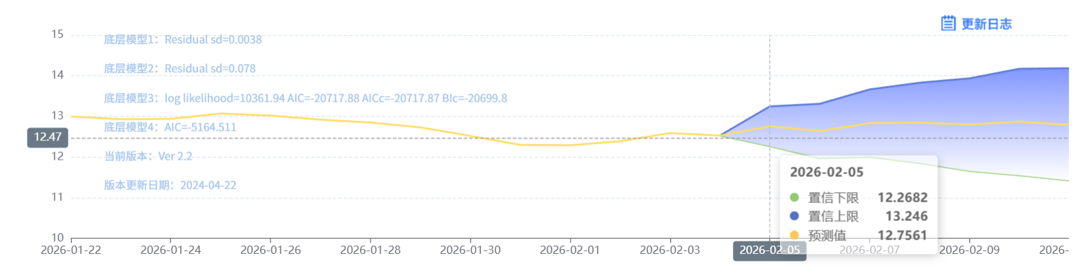 玄田算法是由项目课题组团队原创的非经典逻辑数值聚合理论和不确定性预测方法,构建了基于一致模算子的生猪价格预测模型。该模型采用的聚合函数及一致模相关理论与方法已获得多项国家自然科学基金和省级自然科学资金资助,并获得多项省级自然科学奖奖项。02月05日预测猪价为12.7561,置信区间在12.2682--13.246之间。02月06日预测猪价为12.6407;02月07日预测猪价为12.8349。