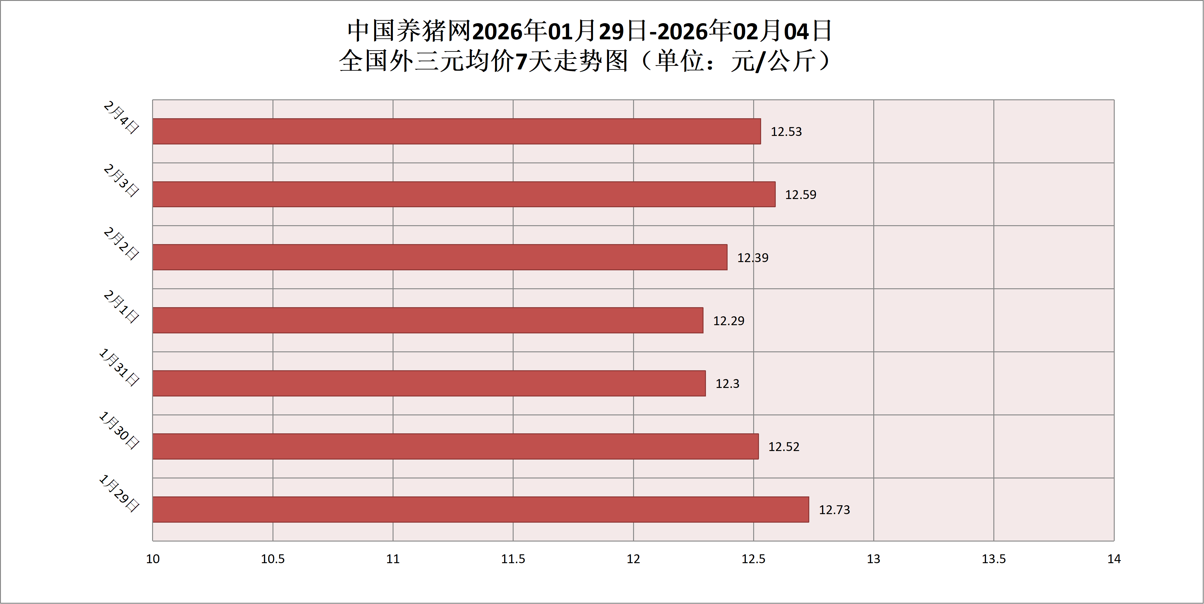 2026年02月04日(星期三),据中国养猪网猪价系统监测,全国外三元均价为12.53元/公斤,猪价较昨日(12.59元/公斤)下跌0.06元/公斤,较上月(12.54元/公斤)下跌了0.01元/公斤。