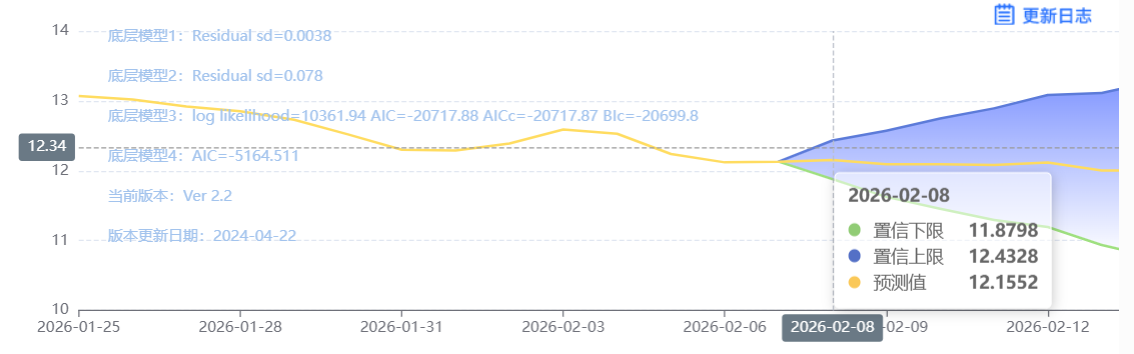 玄田算法是由项目课题组团队原创的非经典逻辑数值聚合理论和不确定性预测方法,构建了基于一致模算子的生猪价格预测模型。该模型采用的聚合函数及一致模相关理论与方法已获得多项国家自然科学基金和省级自然科学资金资助,并获得多项省级自然科学奖奖项。02月08日预测猪价为12.1552,置信区间在11.8798--12.4328之间。02月09日预测猪价为12.0937;02月10日预测猪价为12.0938。