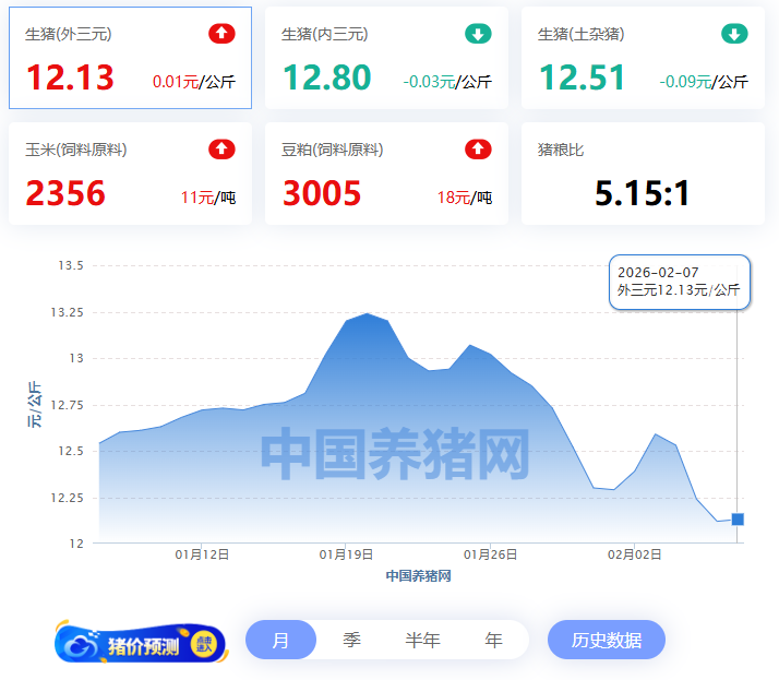 全国(生猪品种:外三元)均价为12.13元/公斤,猪价较昨日上涨0.01元/公斤,环比下跌3.27%,同比下跌20.41%;