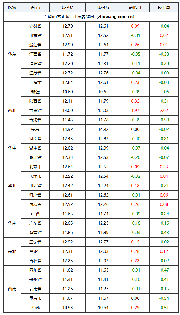 猪价上涨地区(11个):安徽省、浙江省、上海市、陕西省、甘肃省、北京市、山西省、内蒙古自治区、辽宁省、吉林省、黑龙江省、西藏自治区;上涨区间:0.09-1.97元/公斤;