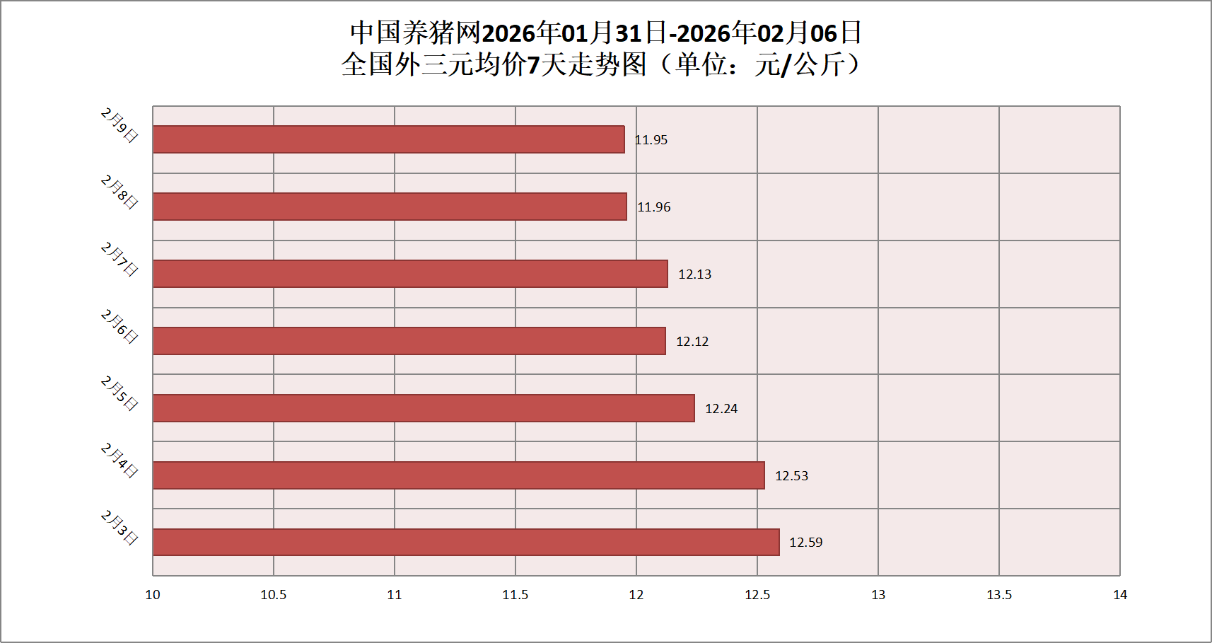 2026年02月09日(星期一),据中国养猪网猪价系统监测,全国外三元均价为11.95元/公斤,猪价较昨日(11.96元/公斤)下跌0.01元/公斤,较上月(12.61元/公斤)下跌了0.66元/公斤。