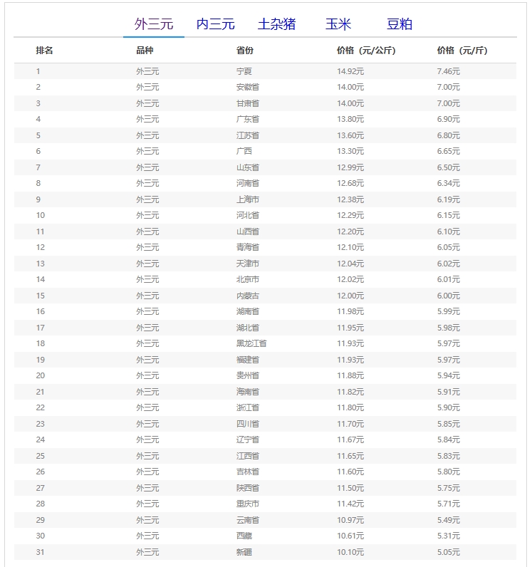 全国外三元生猪价格排行榜