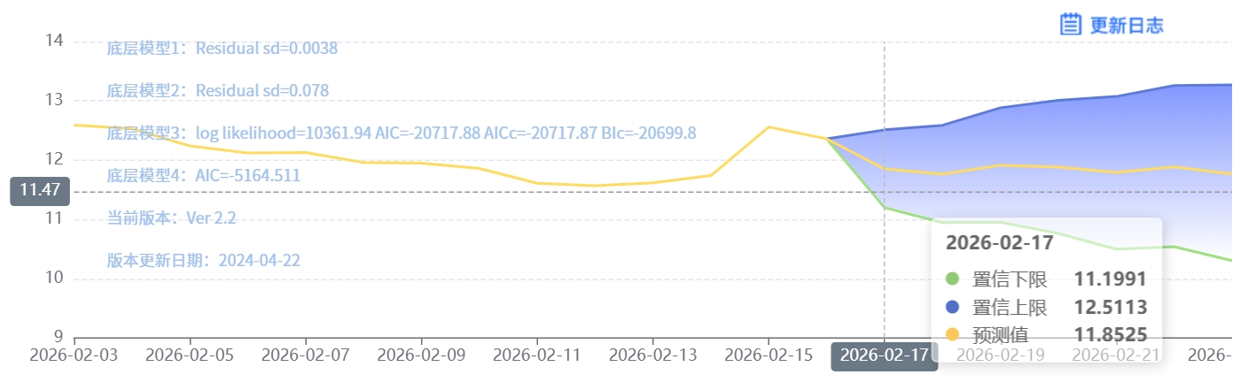 玄田算法是由项目课题组团队原创的非经典逻辑数值聚合理论和不确定性预测方法,构建了基于一致模算子的生猪价格预测模型。该模型采用的聚合函数及一致模相关理论与方法已获得多项国家自然科学基金和省级自然科学资金资助,并获得多项省级自然科学奖奖项。02月17日预测猪价为11.8525,置信区间在11.1991--12.5113之间。02月18日预测猪价为11.7630;02月19日预测猪价为11.9146。