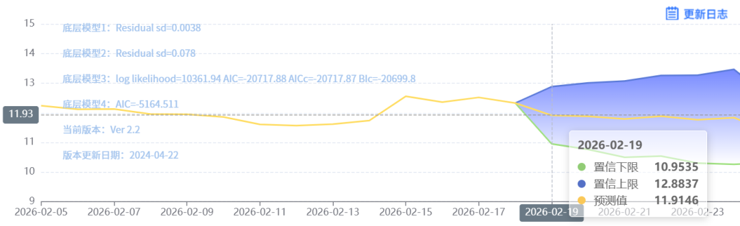 玄田算法是由项目课题组团队原创的非经典逻辑数值聚合理论和不确定性预测方法,构建了基于一致模算子的生猪价格预测模型。该模型采用的聚合函数及一致模相关理论与方法已获得多项国家自然科学基金和省级自然科学资金资助,并获得多项省级自然科学奖奖项。02月19日预测猪价为11.9146,置信区间在10.9535--12.8837之间。02月20日预测猪价为11.8845;02月21日预测猪价为11.7938。