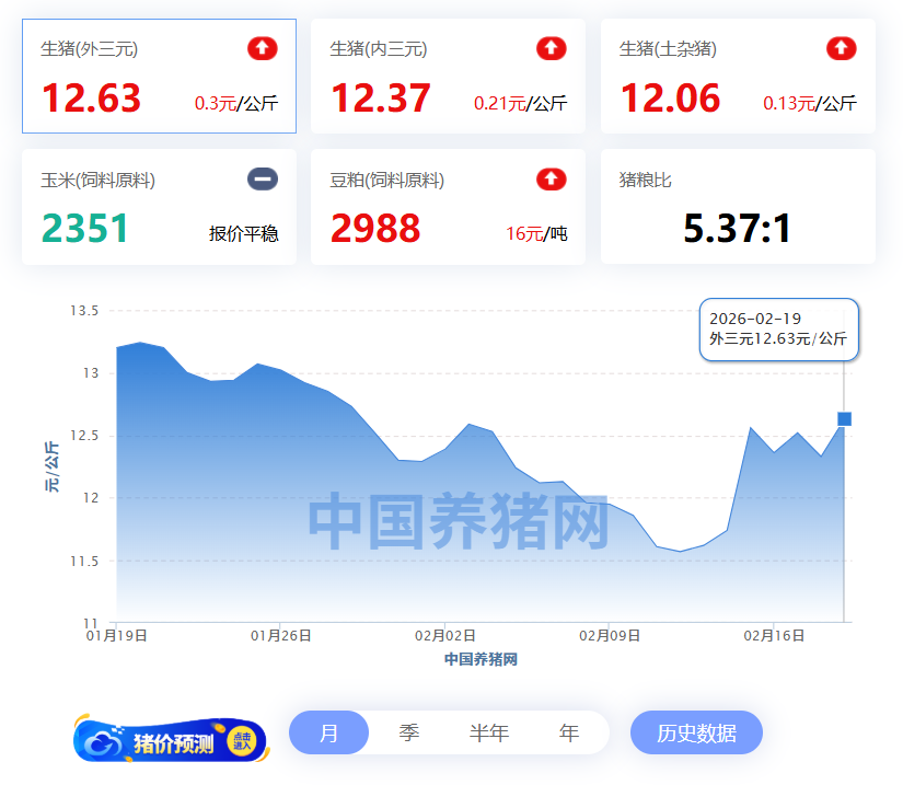 2026年02月19日-中国养猪网全国外三元生猪价格走势图及涨跌表