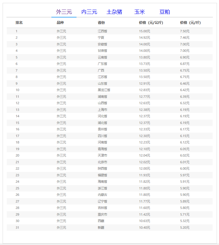 外三元排行前三:江西省15.00元/公斤、宁夏回族自治区14.92元/公斤、安徽省14.00元/公斤;