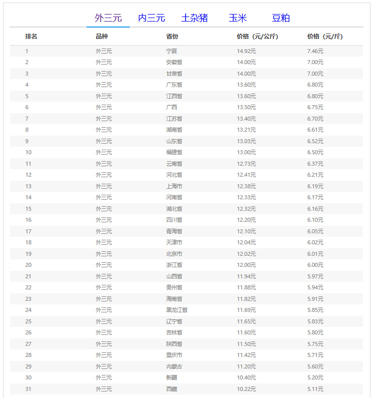 全国外三元生猪价格排行榜