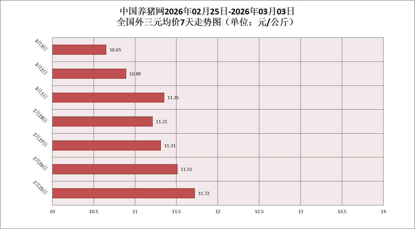 2026年03月03日(星期二),据中国养猪网猪价系统监测,全国外三元均价为10.65元/公斤,猪价较昨日(11.89元/公斤)下跌0.24元/公斤,较上月(12.59元/公斤)下跌了1.94元/公斤。