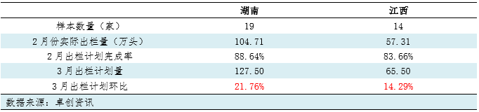 表湖南、江西样本养殖企业2月生猪出栏情况及3月出栏计划
