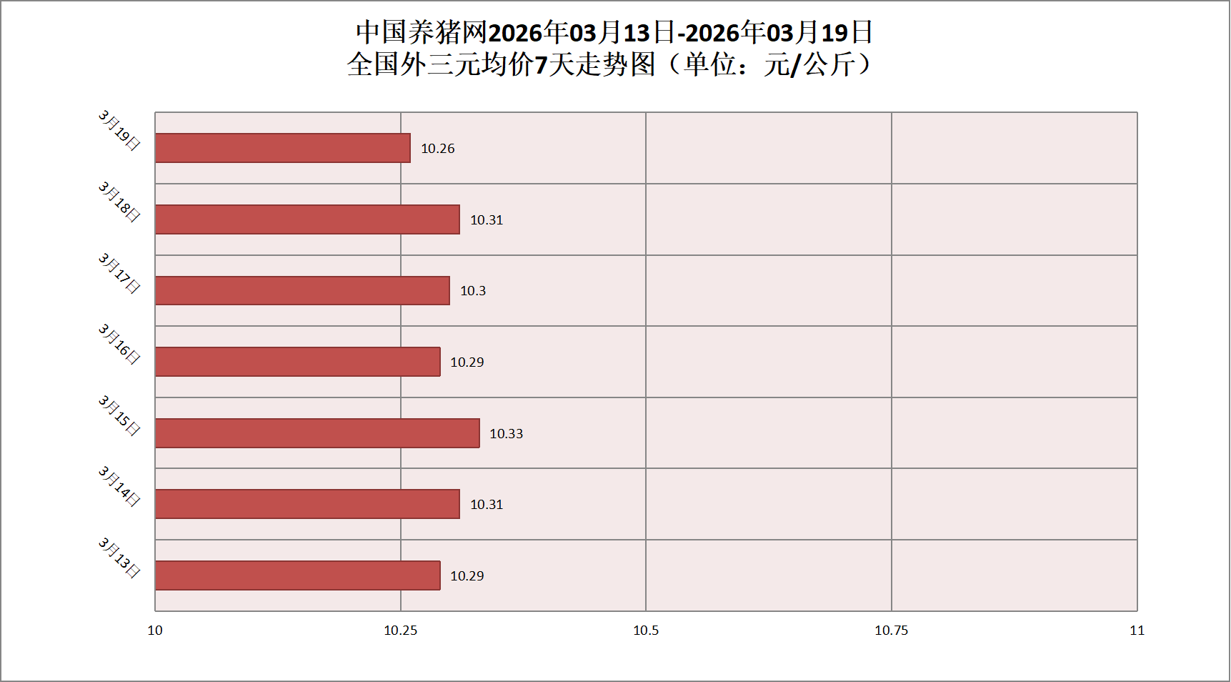 2026年03月19日(星期四),据中国养猪网猪价系统监测,全国外三元均价为10.26元/公斤,猪价较昨日(10.31元/公斤)下跌0.05元/公斤,较上月(12.63元/公斤)下跌了2.37元/公斤。