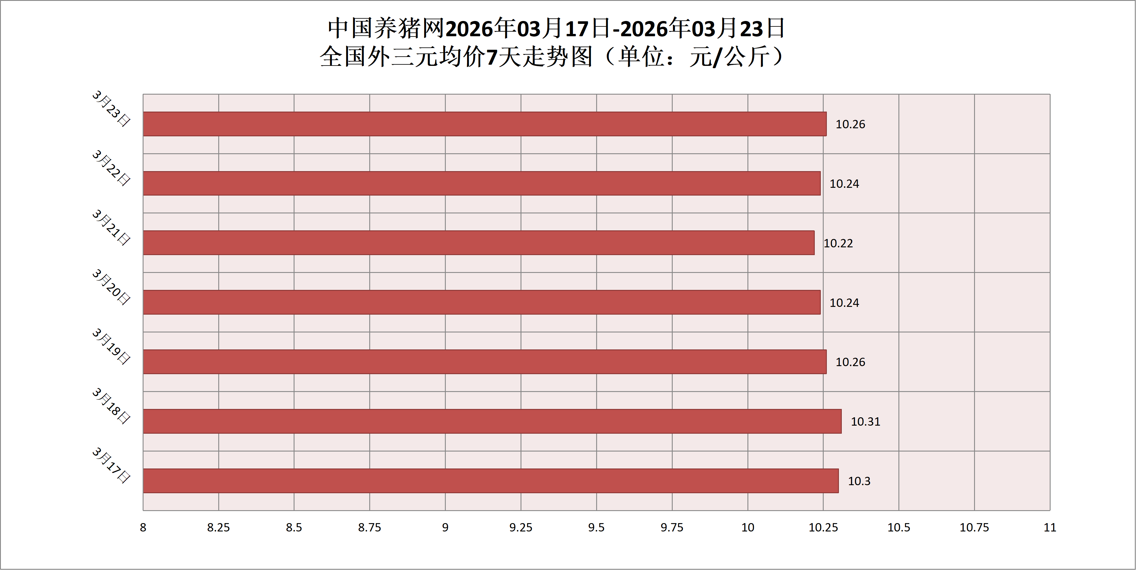 2026年03月23日(星期一),据中国养猪网猪价系统监测,全国外三元均价为10.26元/公斤,猪价较昨日(10.24元/公斤)上涨0.02元/公斤,较上月(12.49元/公斤)下跌了2.23元/公斤。