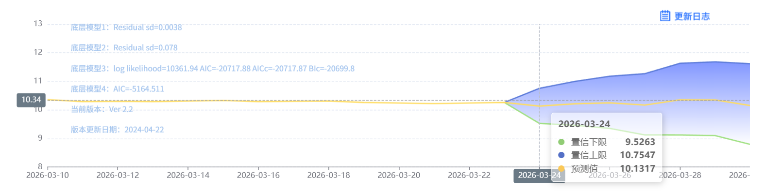 玄田算法是由项目课题组团队原创的非经典逻辑数值聚合理论和不确定性预测方法,构建了基于一致模算子的生猪价格预测模型。该模型采用的聚合函数及一致模相关理论与方法已获得多项国家自然科学基金和省级自然科学资金资助,并获得多项省级自然科学奖奖项03月24日预测猪价为10.1317,置信区间在9.5263--10.7547之间。03月25日预测猪价为10.2124;03月26日预测猪价为10.2461。