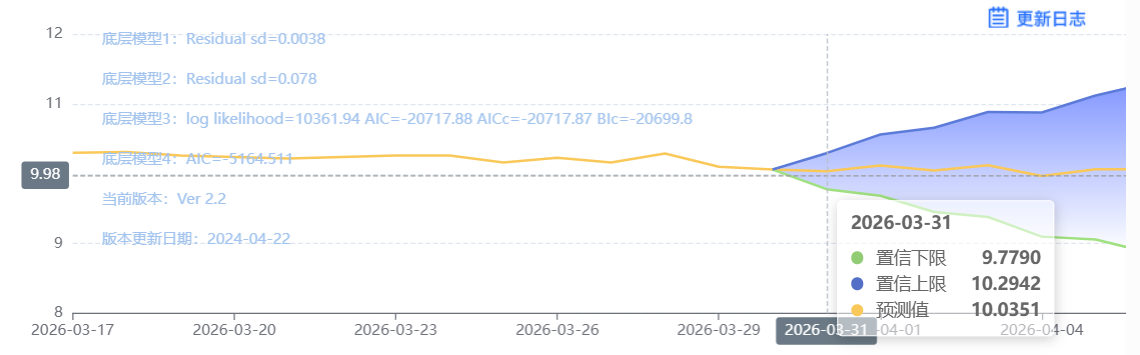 玄田算法是由项目课题组团队原创的非经典逻辑数值聚合理论和不确定性预测方法,构建了基于一致模算子的生猪价格预测模型。该模型采用的聚合函数及一致模相关理论与方法已获得多项国家自然科学基金和省级自然科学资金资助,并获得多项省级自然科学奖奖项。03月31日预测猪价为10.0351,置信区间在9.7790--10.2942之间。04月01日预测猪价为10.1184;04月02日预测猪价为10.0479。