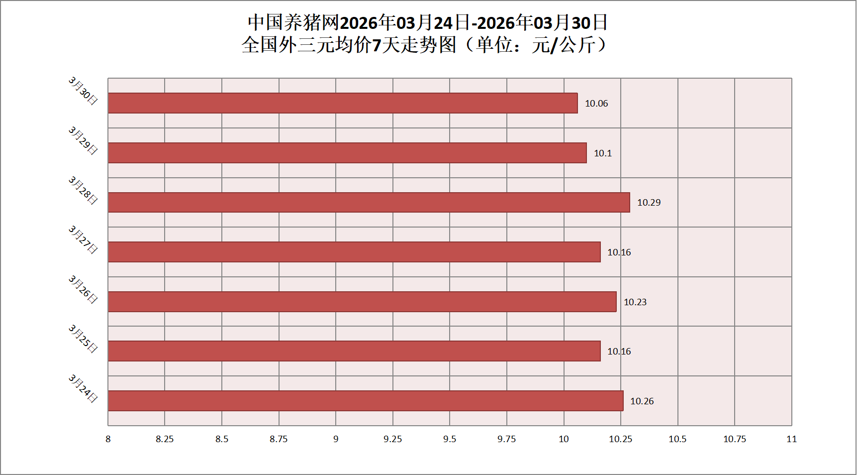 2026年03月30日(星期一),据中国养猪网猪价系统监测,全国外三元均价为10.06元/公斤,猪价较昨日(10.10元/公斤)下跌0.04元/公斤,较上月(11.35元/公斤)下跌了1.29元/公斤。