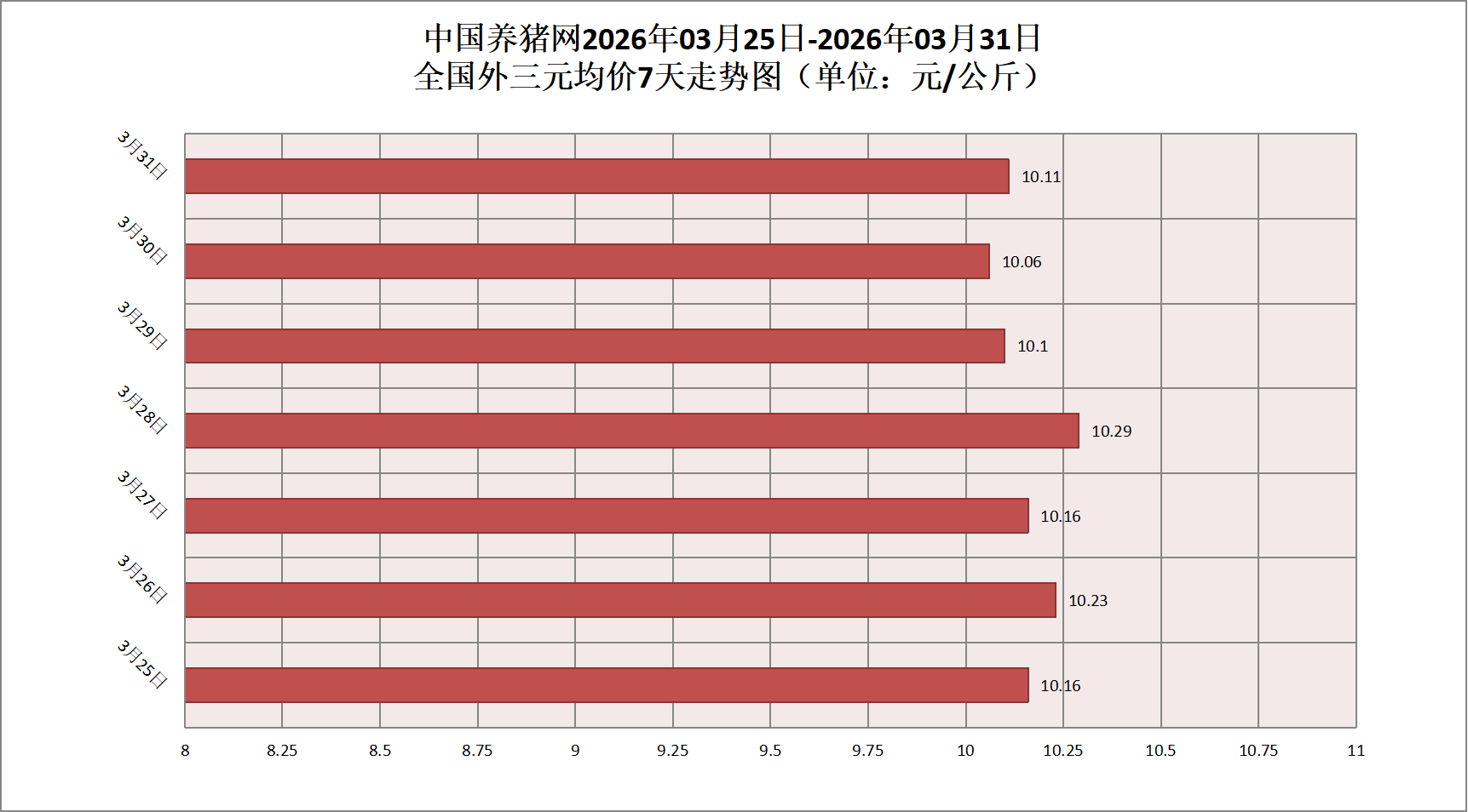 2026年03月31日(星期二),据中国养猪网猪价系统监测,全国外三元均价为10.11元/公斤,猪价较昨日(10.06元/公斤)上涨0.05元/公斤,较上月(11.35元/公斤)下跌了1.24元/公斤。