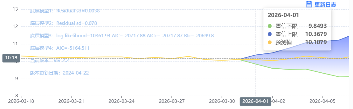 玄田算法是由项目课题组团队原创的非经典逻辑数值聚合理论和不确定性预测方法,构建了基于一致模算子的生猪价格预测模型。该模型采用的聚合函数及一致模相关理论与方法已获得多项国家自然科学基金和省级自然科学资金资助,并获得多项省级自然科学奖奖项。04月01日预测猪价为10.1079,置信区间在9.8493--10.3679之间。04月02日预测猪价为10.0404;04月03日预测猪价为10.1451。