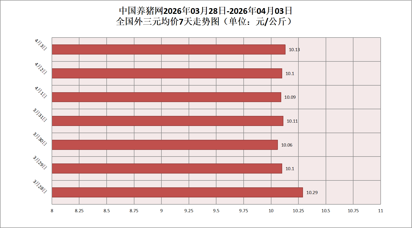2026年04月03日(星期五),据中国养猪网猪价系统监测,全国外三元均价为10.13元/公斤,猪价较昨日(10.10元/公斤)上涨0.03元/公斤,较上月(10.65元/公斤)下跌了0.52元/公斤。