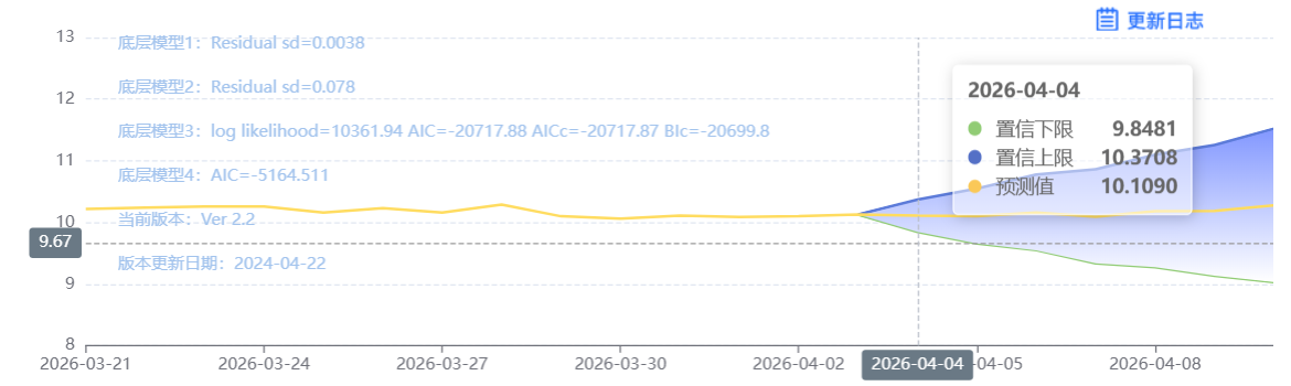 玄田算法是由项目课题组团队原创的非经典逻辑数值聚合理论和不确定性预测方法,构建了基于一致模算子的生猪价格预测模型。该模型采用的聚合函数及一致模相关理论与方法已获得多项国家自然科学基金和省级自然科学资金资助,并获得多项省级自然科学奖奖项。04月03日预测猪价为10.0578,置信区间在9.7968--10.3187之间。04月04日预测猪价为10.0931;04月05日预测猪价为10.1128。