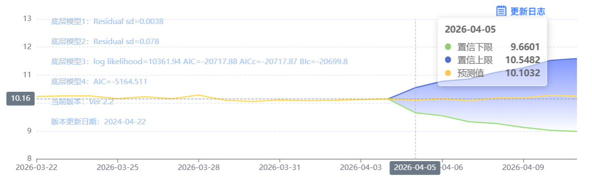 玄田算法是由项目课题组团队原创的非经典逻辑数值聚合理论和不确定性预测方法,构建了基于一致模算子的生猪价格预测模型。该模型采用的聚合函数及一致模相关理论与方法已获得多项国家自然科学基金和省级自然科学资金资助,并获得多项省级自然科学奖奖项。04月05日预测猪价为10.1032,置信区间在9.6601--10.5482之间。04月06日预测猪价为10.1619;04月07日预测猪价为10.0924。