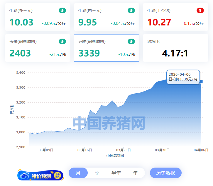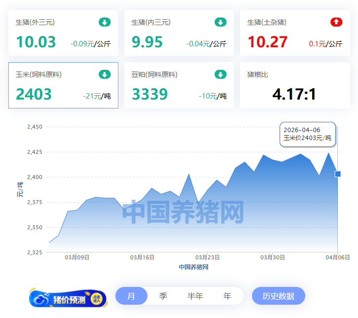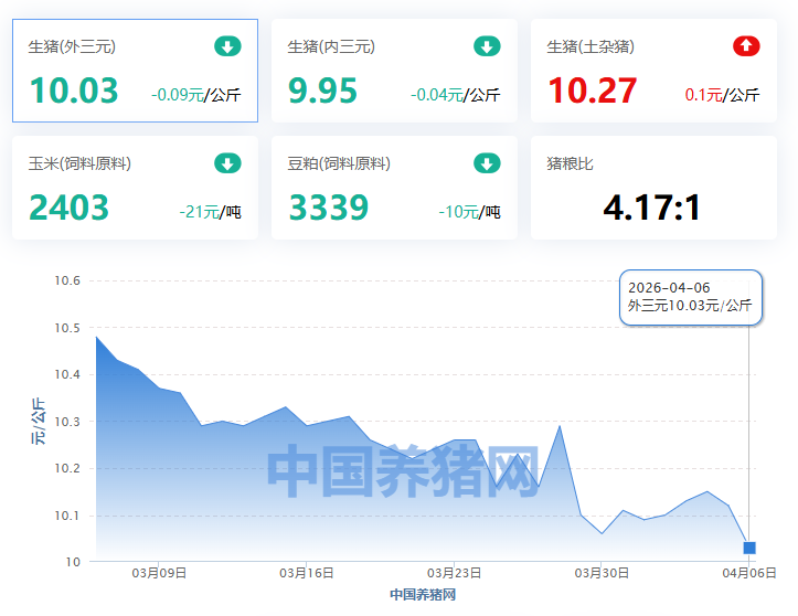 全国(生猪品种:外三元)均价为10.03元/公斤,猪价较昨日下跌0.09元/公斤,环比下跌4.29%,同比下跌31.58%;