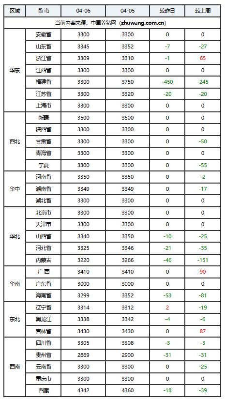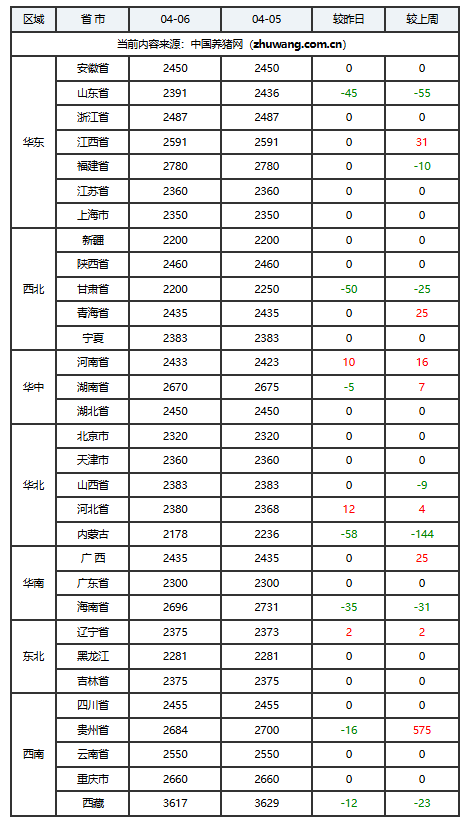猪价下跌地区(9个):安徽省、湖南省、山东省、浙江省、海南省、内蒙古自治区、山西省、贵州省、西藏自治区;下跌区间:0.05-0.80元/公斤;