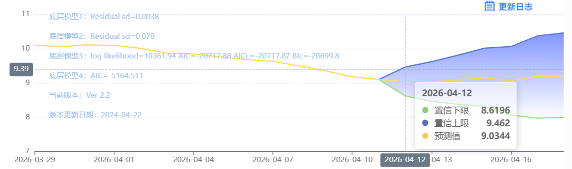玄田算法是由项目课题组团队原创的非经典逻辑数值聚合理论和不确定性预测方法,构建了基于一致模算子的生猪价格预测模型。该模型采用的聚合函数及一致模相关理论与方法已获得多项国家自然科学基金和省级自然科学资金资助,并获得多项省级自然科学奖奖项。04月12日预测猪价为9.0344,置信区间在8.6196--9.462之间。04月13日预测猪价为9.0305;04月14日预测猪价为9.0815。