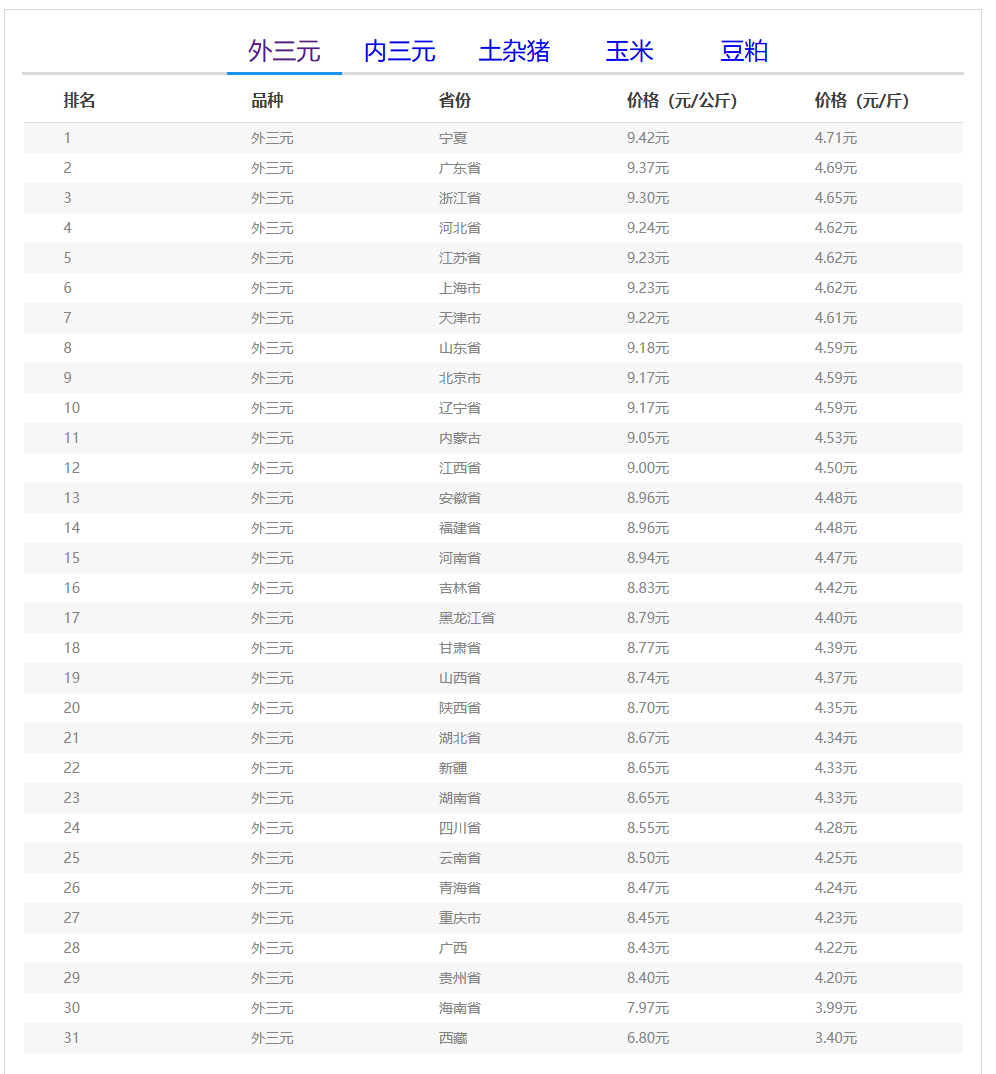 外三元排行前三:宁夏回族自治区9.42元/公斤、广东省9.37元/公斤、浙江省9.30元/公斤;