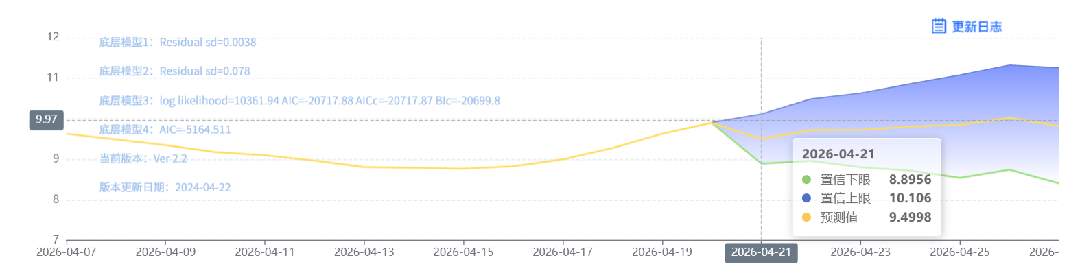 玄田算法是由项目课题组团队原创的非经典逻辑数值聚合理论和不确定性预测方法,构建了基于一致模算子的生猪价格预测模型。该模型采用的聚合函数及一致模相关理论与方法已获得多项国家自然科学基金和省级自然科学资金资助,并获得多项省级自然科学奖奖项。04月21日预测猪价为9.4998,置信区间在8.8956--10.106之间。04月22日预测猪价为9.7218;04月23日预测猪价为9.7249。