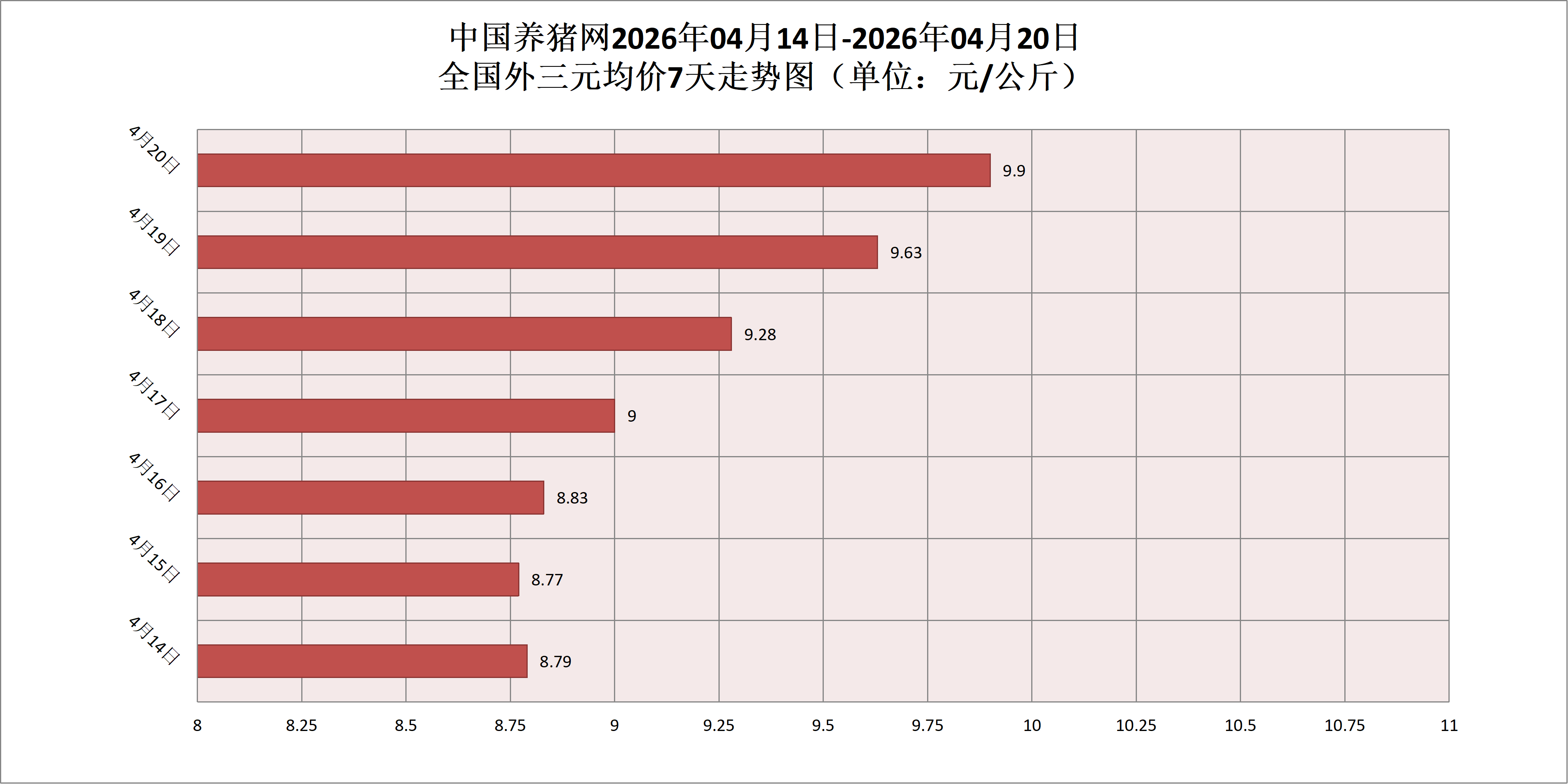 2026年04月20日(星期一),据中国养猪网猪价系统监测,全国外三元均价为9.90元/公斤,猪价较昨日(9.63元/公斤)上涨0.27元/公斤,较上月(10.24元/公斤)下跌了0.34元/公斤。