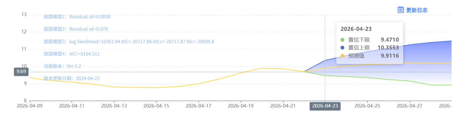 玄田算法是由项目课题组团队原创的非经典逻辑数值聚合理论和不确定性预测方法,构建了基于一致模算子的生猪价格预测模型。该模型采用的聚合函数及一致模相关理论与方法已获得多项国家自然科学基金和省级自然科学资金资助,并获得多项省级自然科学奖奖项。04月23日预测猪价为9.9116,置信区间在9.4710--10.3553之间。04月24日预测猪价为10.0249;04月25日预测猪价为10.1145。