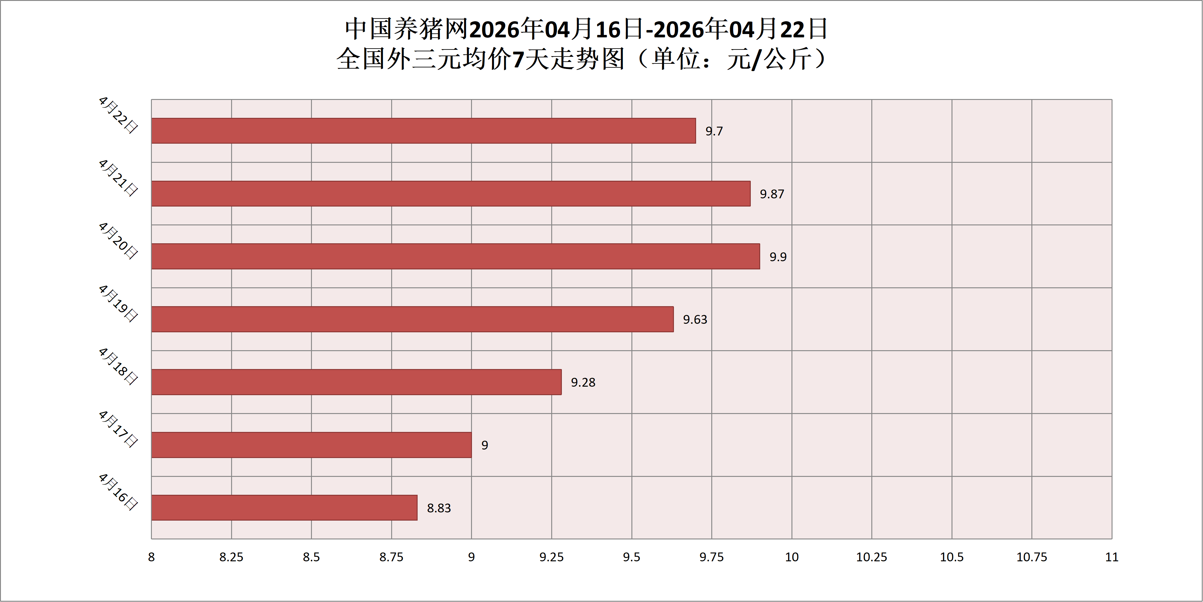2026年04月22日(星期三),据中国养猪网猪价系统监测,全国外三元均价为9.70元/公斤,猪价较昨日(9.87元/公斤)下跌0.13元/公斤,较上月(10.24元/公斤)下跌了0.54元/公斤。