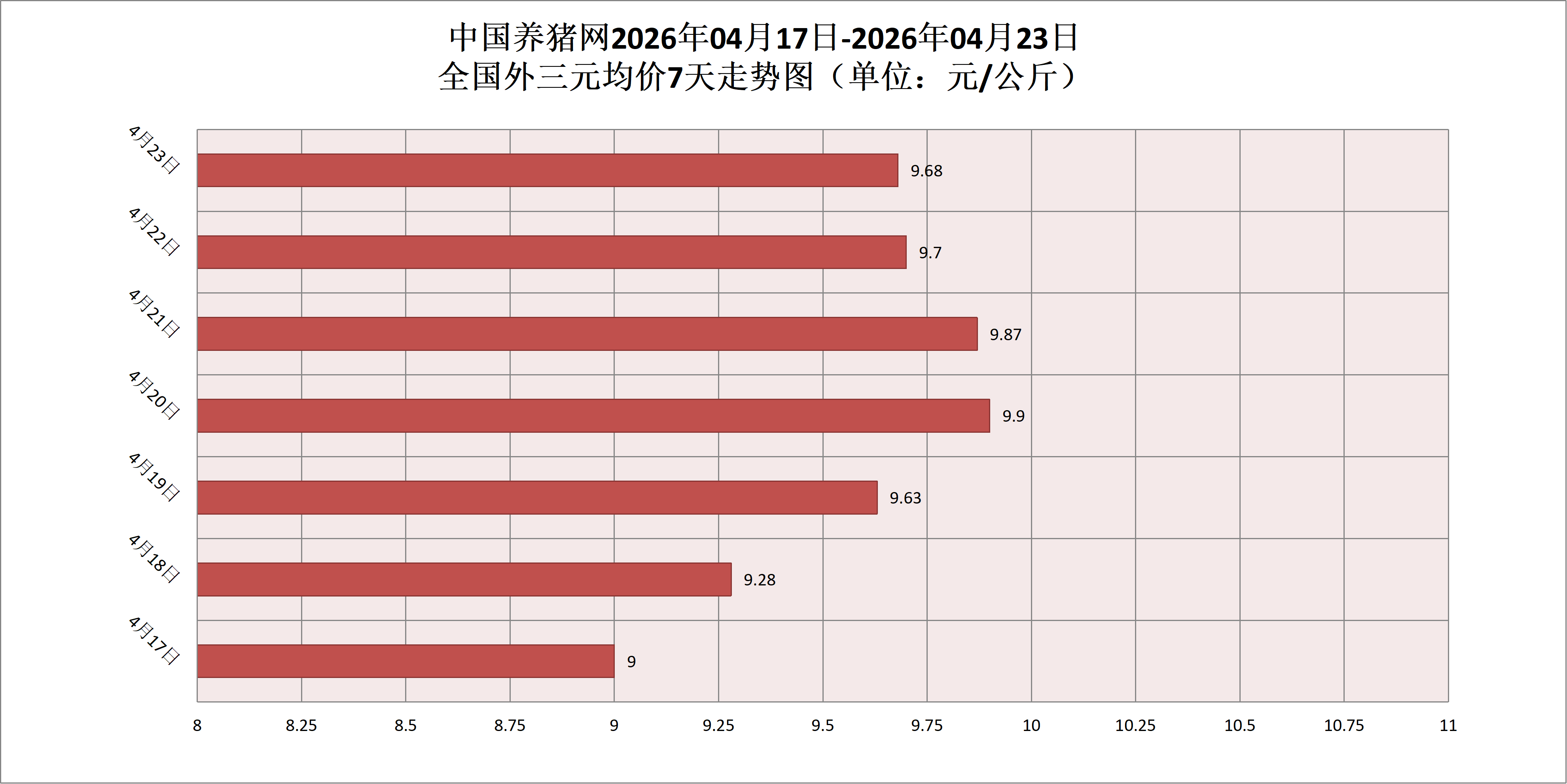 2026年04月23日(星期四),据中国养猪网猪价系统监测,全国外三元均价为9.68元/公斤,猪价较昨日(9.70元/公斤)下跌0.02元/公斤,较上月(10.26元/公斤)下跌了0.58元/公斤。
