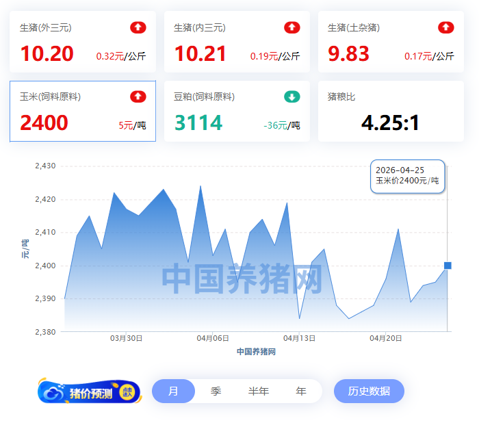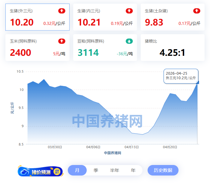 全国(生猪品种:外三元)均价为10.20元/公斤,猪价较昨日上涨0.32元/公斤,环比上涨0.39%,同比下跌31.95%;