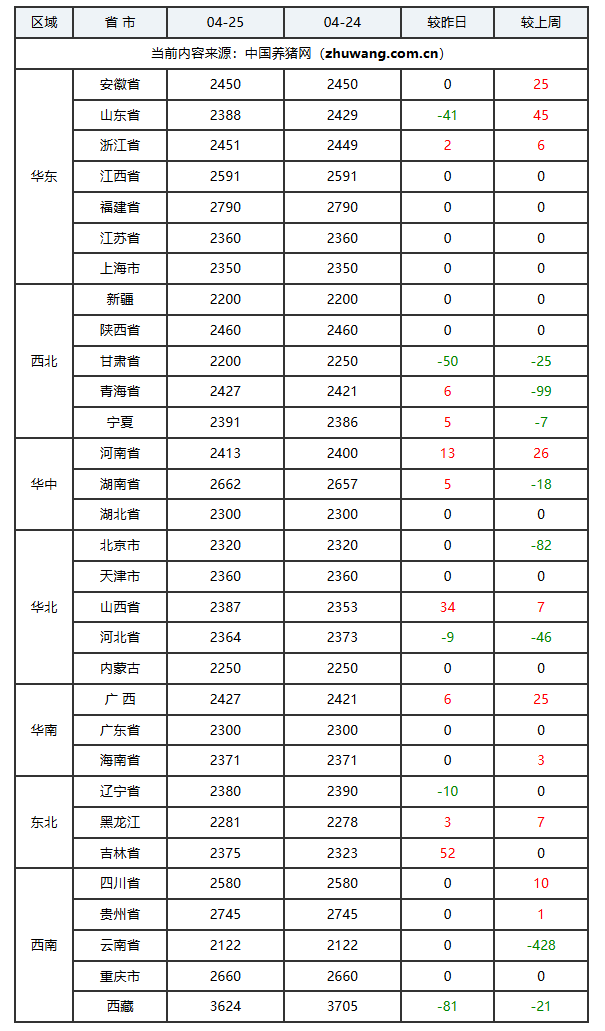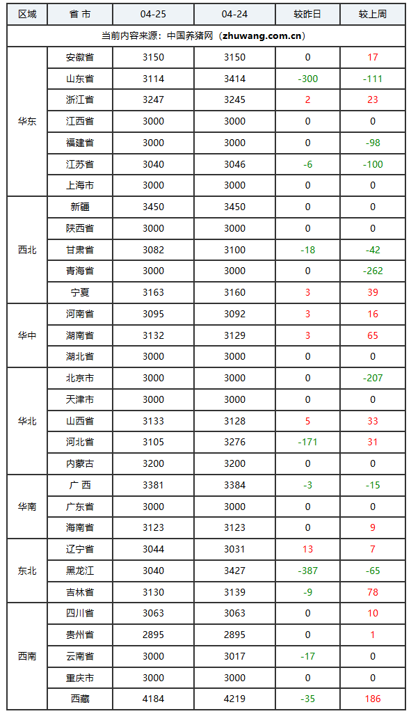 猪价上涨地区(31个):山东省、吉林省、贵州省、青海省、河南省、天津市、北京市、山西省、内蒙古自治区、西藏自治区、云南省、重庆市、河北省;上涨区间:0.04-0.57元/公斤;