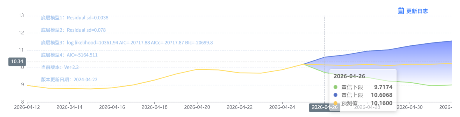 玄田算法是由项目课题组团队原创的非经典逻辑数值聚合理论和不确定性预测方法,构建了基于一致模算子的生猪价格预测模型。该模型采用的聚合函数及一致模相关理论与方法已获得多项国家自然科学基金和省级自然科学资金资助,并获得多项省级自然科学奖奖项。04月26日预测猪价为10.1600,置信区间在9.7174--10.6068之间。04月27日预测猪价为10.1272;04月28日预测猪价为10.1902。