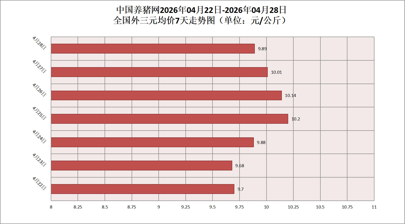 2026年04月28日(星期二),据中国养猪网猪价系统监测,全国外三元均价为9.89元/公斤,猪价较昨日(10.01元/公斤)下跌0.12元/公斤,较上月(10.29元/公斤)下跌了0.4元/公斤。