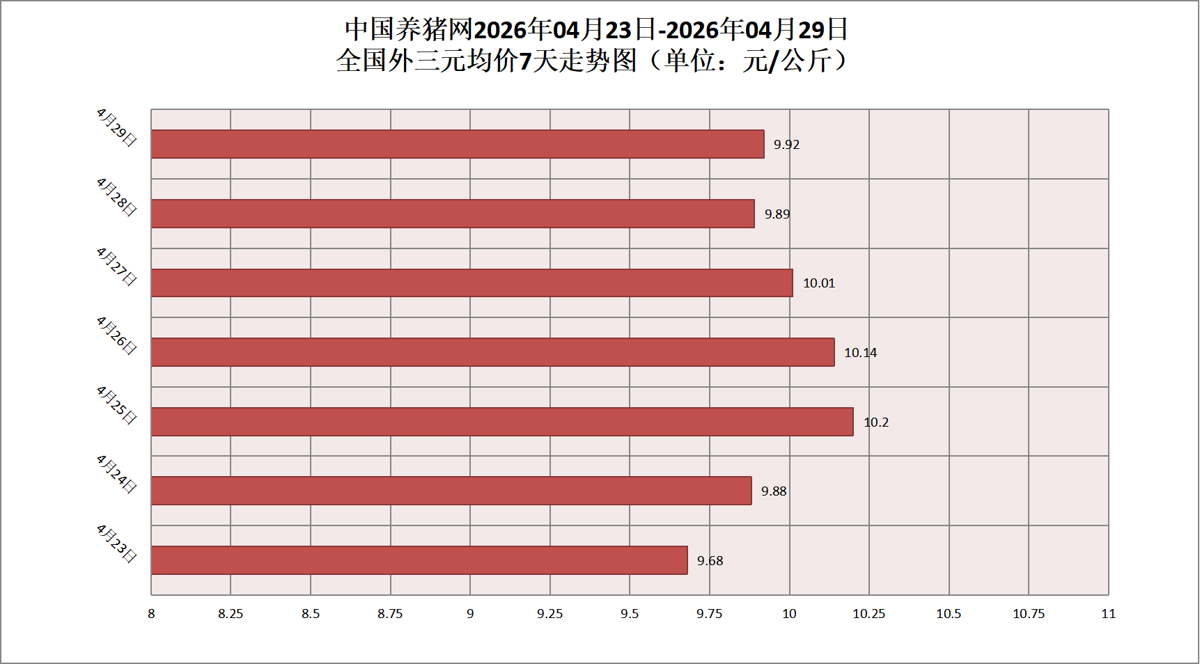 2026年04月29日(星期三),据中国养猪网猪价系统监测,全国外三元均价为9.92元/公斤,猪价较昨日(9.89元/公斤)上涨0.03元/公斤,较上月(10.1元/公斤)下跌了0.18元/公斤。