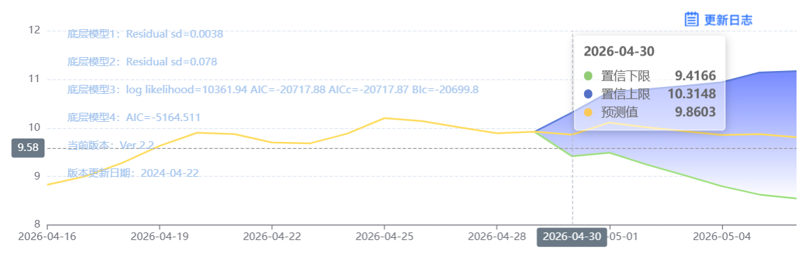 玄田算法是由项目课题组团队原创的非经典逻辑数值聚合理论和不确定性预测方法,构建了基于一致模算子的生猪价格预测模型。该模型采用的聚合函数及一致模相关理论与方法已获得多项国家自然科学基金和省级自然科学资金资助,并获得多项省级自然科学奖奖项。04月30日预测猪价为9.8603,置信区间在9.4166--10.3148之间。05月01日预测猪价为10.1084;05月02日预测猪价为10.0103。