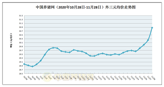 2020年11月28日(星期六),中国养猪网猪价系统数据监测如下:生猪(品种:外三元)均价为30.87元/公斤,价格较昨日上涨了0.64元/公斤;较上周上涨了1.29元/公斤;较上月上涨了1.95元/公斤,环比上涨了6.84%。