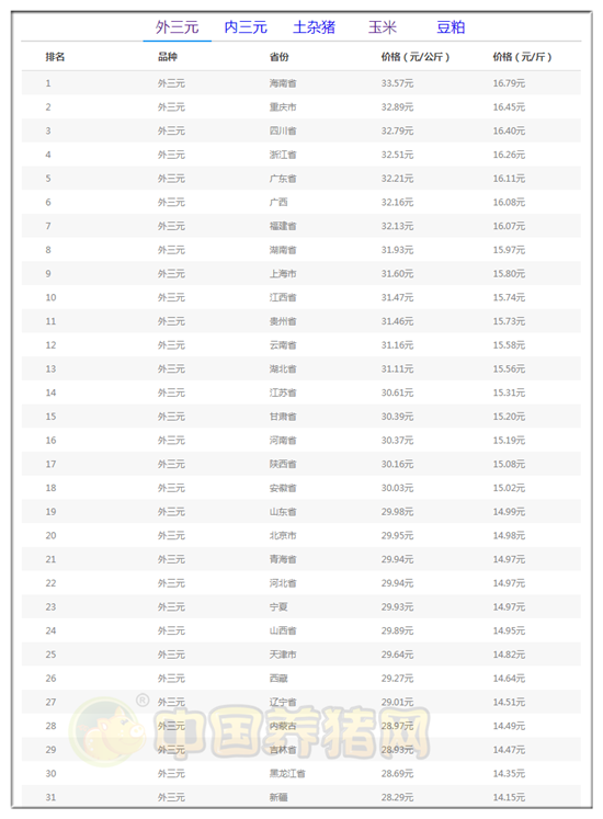 (1)海南省33.57元/公斤(16.79元/斤);(2)重庆市32.89元/公斤(16.45元/斤);(3)四川32.79元/公斤(16.40元/斤);(4)浙江省32.51元/公斤(16.26元/斤);(5)广东省32.21元/公斤(16.11元/公斤);(6)广西壮族自治区32.16公斤(16.08元/斤);(7)福建省32.13元/公斤(16.07元/斤);(8)湖南省31.93元/公斤(15.97元/斤);(9)上海市31.60元/公斤(15.80元/斤);(10)江西省31.47元/公斤(15.74元/斤)。