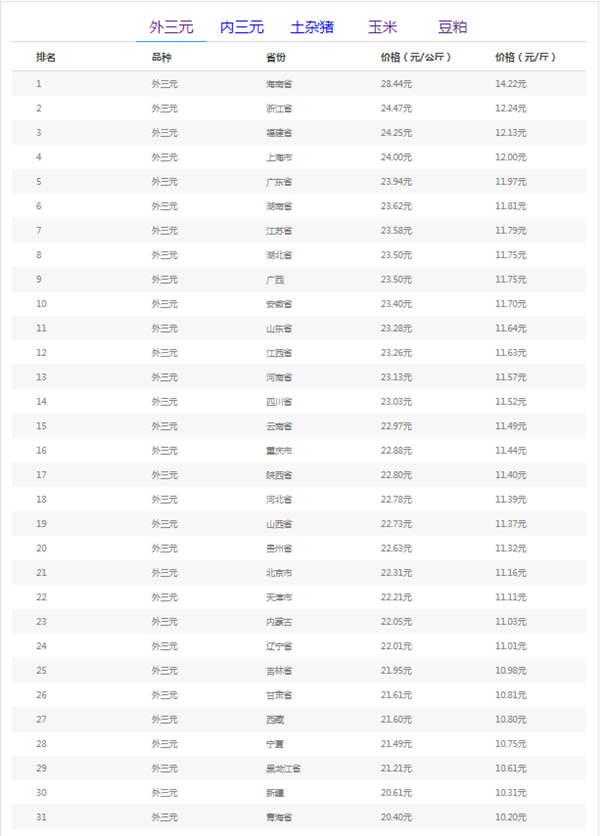 【1】海南省猪价28.44元/公斤(14.22元/斤);