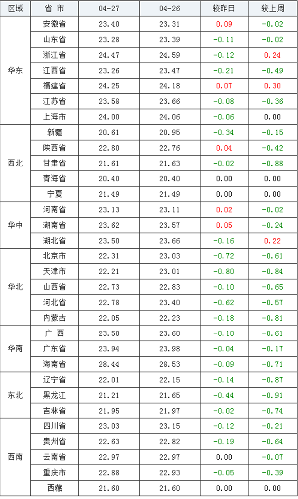 根据“2021年04月27日-中国养猪网生猪(外三元)均价涨跌表”分析结果得出,今日猪价基本上全面下跌,华东地区、东北地区、华中地区、华北地区、华南地区、西南地区开始全面下跌,今日外三元涨跌表中只有星星点点的红色,各地猪价表现出的价格已经不太可观,最为引人注目的是天津市、河北省、北京市等地区,华北平原的猪价经历了重大创击,下跌幅度在全国下跌占比中约等于一半。