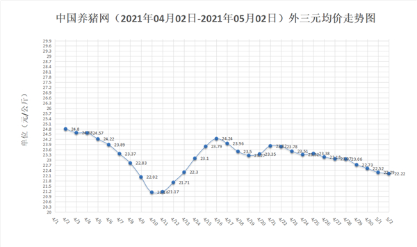 2021年05月02日(星期日),中国养猪网猪价系统数据监测如下:生猪(品种:外三元)均价为22.22元/公斤(11.11元/斤),价格较昨日下跌了0.07元/公斤(0.04元/斤);猪价环比下跌了10.40%,同比下跌了30.84%;