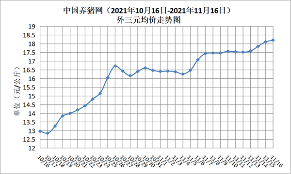 2021年10月16日-2021年11月16日中国养猪网生猪(外三元)均价走势图