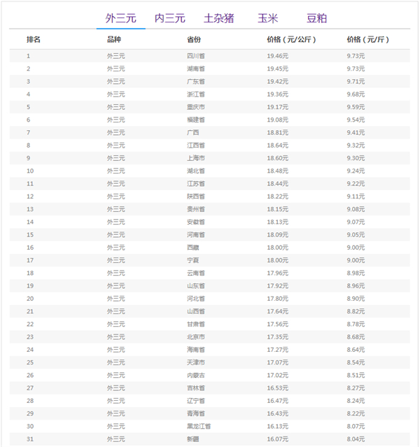 【1】四川省猪价19.46元/公斤(9.73元/斤);