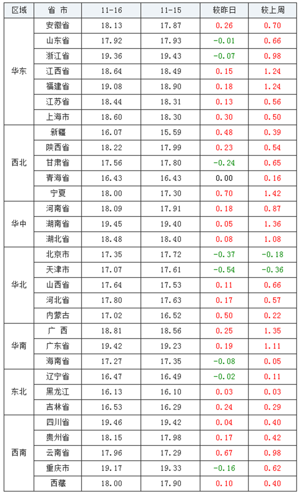 2021年11月16日-中国养猪网生猪(外三元)均价涨跌表