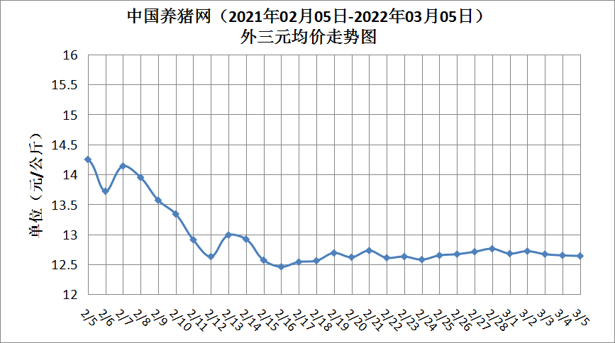 2021年02月05日-2022年03月05日中国养猪网生猪(外三元)均价走势图